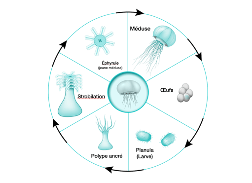 La reproduction d’une grande majorité d’espèces de méduses repose sur le principe de la fécondation externe. Mâles et femelles libèrent dans l’eau des cellules reproductrices dont les rencontres font naître des larves microscopiques, appelées planula. À ce stade, rien ne distingue cette forme de vie élémentaire des organismes planctoniques. La planula dérive au gré des courants avant de s’ancrer à une surface solide, afin de permettre à la larve de se transformer en polype. Immobile, discret et quasiment invisible, le polype ressemble davantage à une tige végétale qu’à un animal marin. Cet aspect anodin, dépourvu d’intérêt pour ses éventuels prédateurs, maximise ses chances de parvenir à s’enraciner et se nourrir.