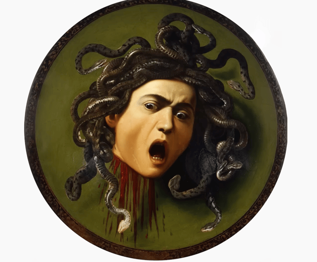 Au fil des siècles, les artistes ont fait du personnage mythologique de Méduse un symbole puissant. De la Renaissance à l’époque baroque, elle est représentée comme une figure ambivalente, à la fois monstrueuse et fascinante. En 1598, le Caravage immortalisa le célèbre bouclier réfléchissant offert à Persée par Athéna, déesse de la guerre et de la sagesse, dans le but de renvoyer le reflet du regard de la Gorgone. Sur le bouclier, l’artiste parvint à peindre la tête tranchée de cette dernière, qui semble émerger de la surface du métal, dans un cri d’effroi symbolisant une horreur figée, suspendue et hypnotique.