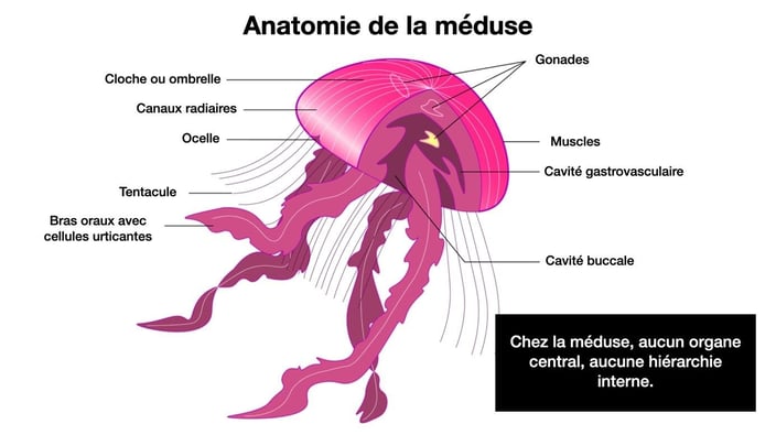 À première vue, la méduse est très éloignée du concept classique d’animal. Elle est dépourvue de tête, ne possède ni queue, ni squelette, ni carapace. Elle n’a pas davantage de cœur, de poumons ou de cerveau qui lui permettrait de traiter l’information que ses nombreux capteurs collectent. Et pourtant, elle se nourrit, se déplace, réagit à son environnement et se reproduit sans difficulté, autant de fonctions qui justifient pleinement sa place dans la catégorie des animaux.