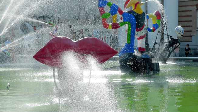 En France, Niki collabore avec Jean Tinguely pour créer la Fontaine Stravinsky, que le couple installe à proximité du Centre Georges-Pompidou, sur la place Igor Stravinsky. Inaugurée en 1983, cette sculpture établit un dialogue entre les formes rondes et colorées créées par Niki et les structures mécaniques noires inventées par Tinguely, donnant naissance à une œuvre vivante, animée et joyeuse. L’eau, le mouvement et la couleur transforment le lieu en espace ludique et poétique, qui rend hommage aux compositions de Stravinsky et devient rapidement l’un des principaux repères culturels du centre de la capitale.